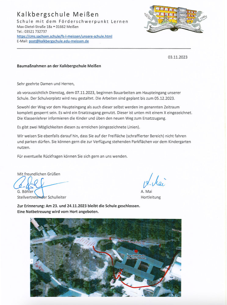 Mit diesem Schulleiterbrief möchten wir alle Schüler, Eltern und Besucher unserer Schule darauf hinweisen, dass ab dem 7. November 2023 vor dem Haupteingang unserer Schule längerfristige Baumaßnahmen erfolgen, die den Zugang zu unserer Schule einschränken.